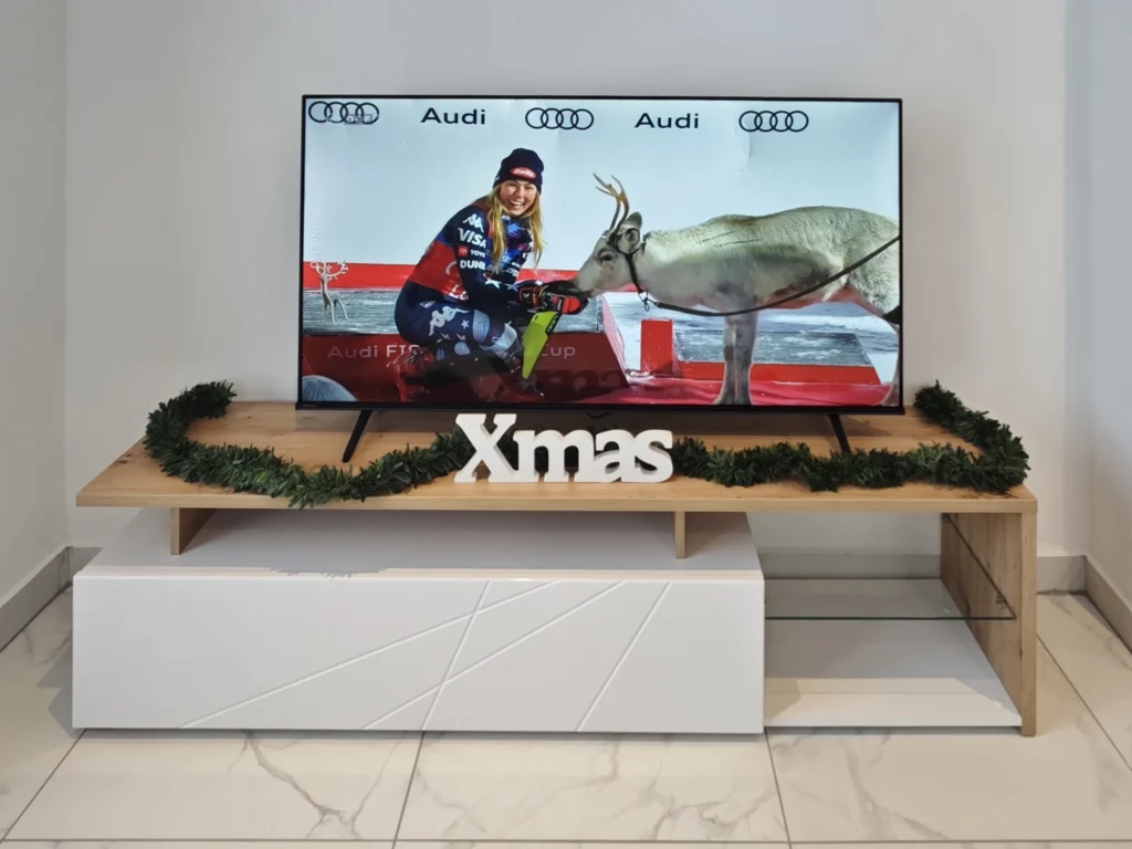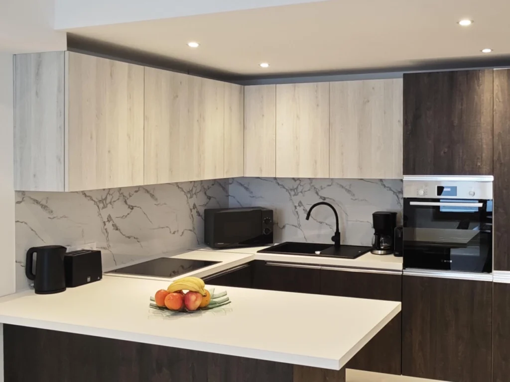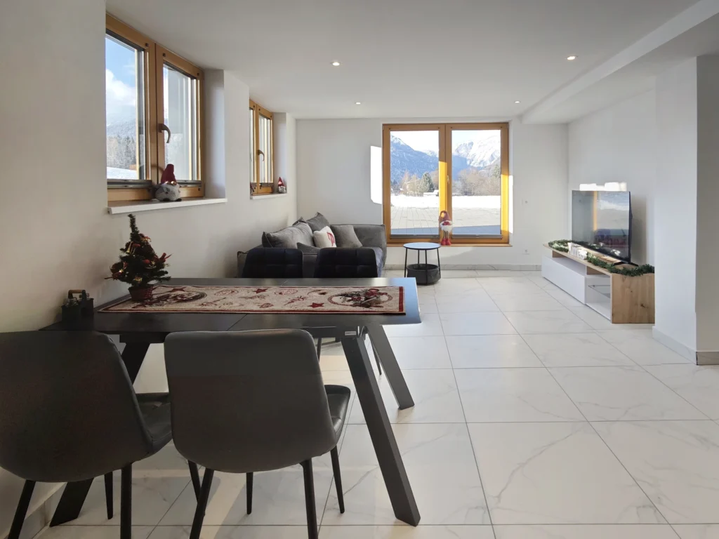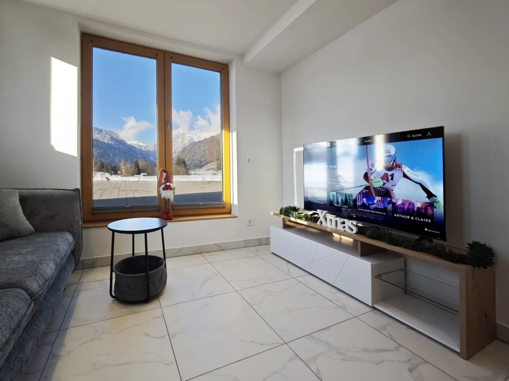 The heart of the apartment is a bright, open-concept living space that seamlessly combines the kitchen, dining, and lounge areas. For your relaxation, the living area features a comfortable double sofa bed (measuring 160x190cm when extended), perfectly positioned in front of a large-screen Smart TV. You will have access to a wide range of entertainment, including Netflix, Disney+, YouTube, and ORF, all supported by fast, complimentary Wi-Fi throughout the entire property.