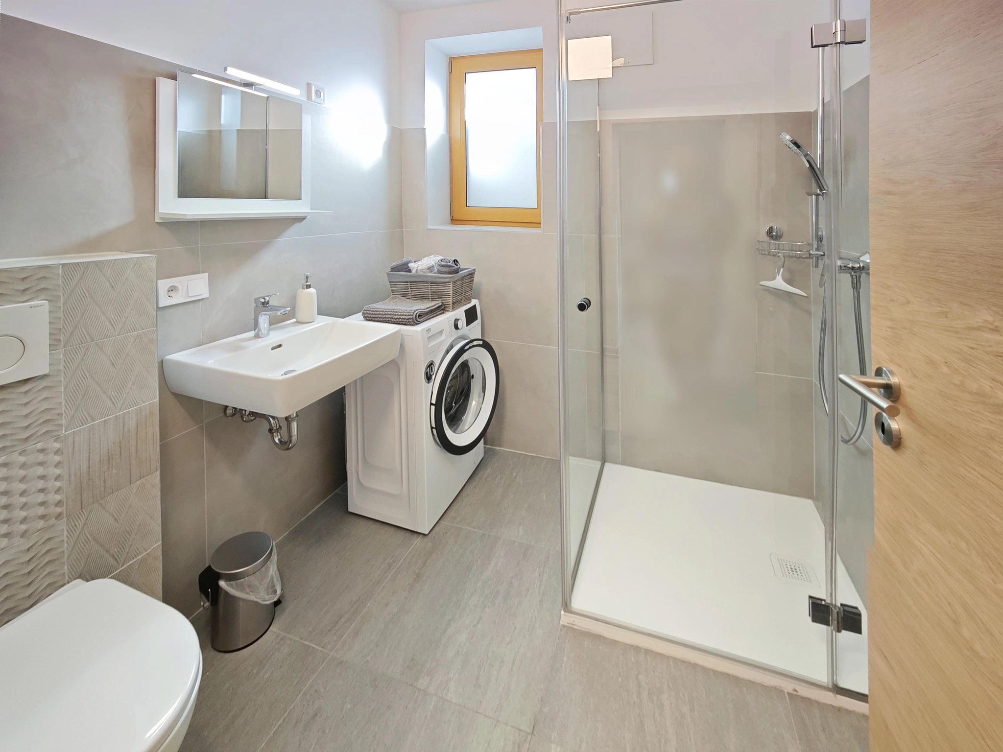The bathroom is designed for both comfort and functionality, featuring a modern walk-in shower, a washbasin, and a toilet. A heated towel rail is provided to ensure your towels are always warm and dry after a refreshing shower. For your convenience, especially during longer stays, the bathroom also includes a private washing machine—perfect for keeping your clothes and sports gear fresh throughout your holiday.