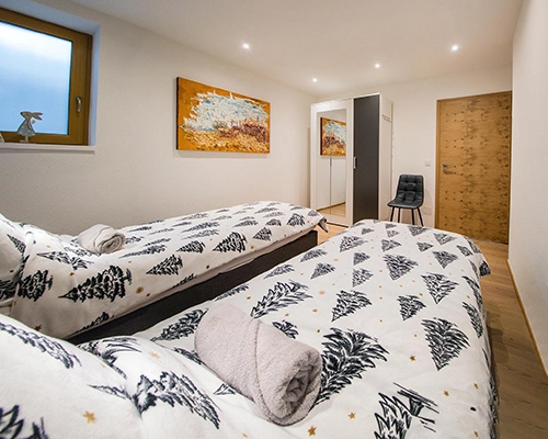 The second bedroom offers excellent flexibility, featuring two comfortable 90x200cm single beds that can be easily joined together to suit your preferences. Just like the master suite, this room is equipped with a spacious three-door wardrobe, providing plenty of room for both folded and hanging clothes. This versatile setup makes the space an ideal choice for friends, children, or a second couple seeking a peaceful retreat.
